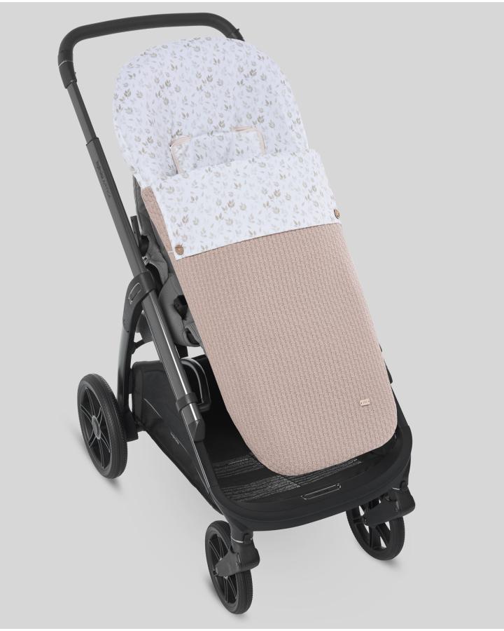 Saco universal para sillas de paseo confeccionado en punto de algodón combinado con tejido popelín estampado vegetal. Embozo cuadrado. Cremalleras laterales para convertir el saco en colchoneta. Refuerzo de polipiel en los pies. Relleno del cubrepiés extraible.