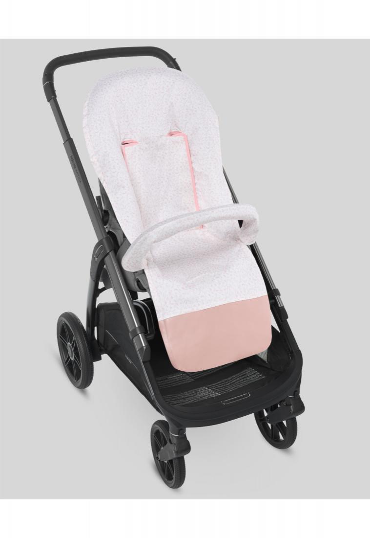 Colchoneta para sillas de paseo confeccionada en loneta de estampado vegetal. Cubre barra a juego y refuerzo de polipiel en los pies.